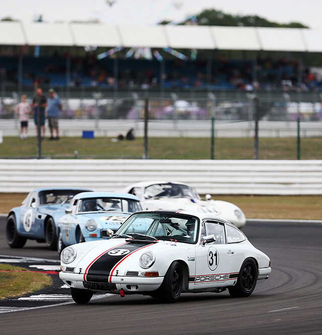 Will Nuthall secured the first HGPCA Pre-1966 Grand Prix race in his 1960 Cooper T53. Julian Thomas then won the International Trophy for Classic GT Cars with a 1965 Shelby American Cobra Daytona. Olivier Hart, who had been in contention with another Cobra, was penalised for contact with Sir Chris Hoy’s 1963 Chevrolet Corvette Stingray during a pitstop.